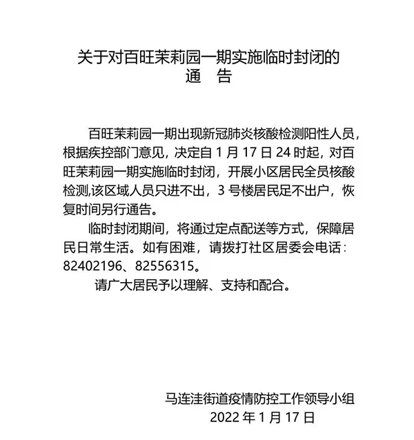 海淀马连洼街道疫情防控工作领导小组发布通告,百旺茉莉园一期实施临时封闭。 通告显示,百旺茉莉园一期出现新冠肺炎核酸检测阳性人员,根据疾控部门意见,决定自1月17日24时起对百旺茉莉园一期实施临时封闭,开展小区居民全员核酸检测,该区域人员只进不出,3号楼居民足不出户,恢复时间另行通告。临时封闭期间,将