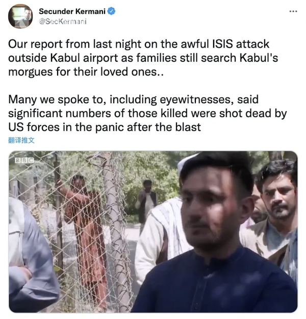 “我们昨晚的报道是关于喀布尔机场外发生的ISIS恐袭事件,遇难者家属们仍在喀布尔的停尸房寻找他们的亲人。采访中,包括目击者在内的许多人都表示,大量死者是在爆炸后引发的恐慌中被美军开枪射杀的。”