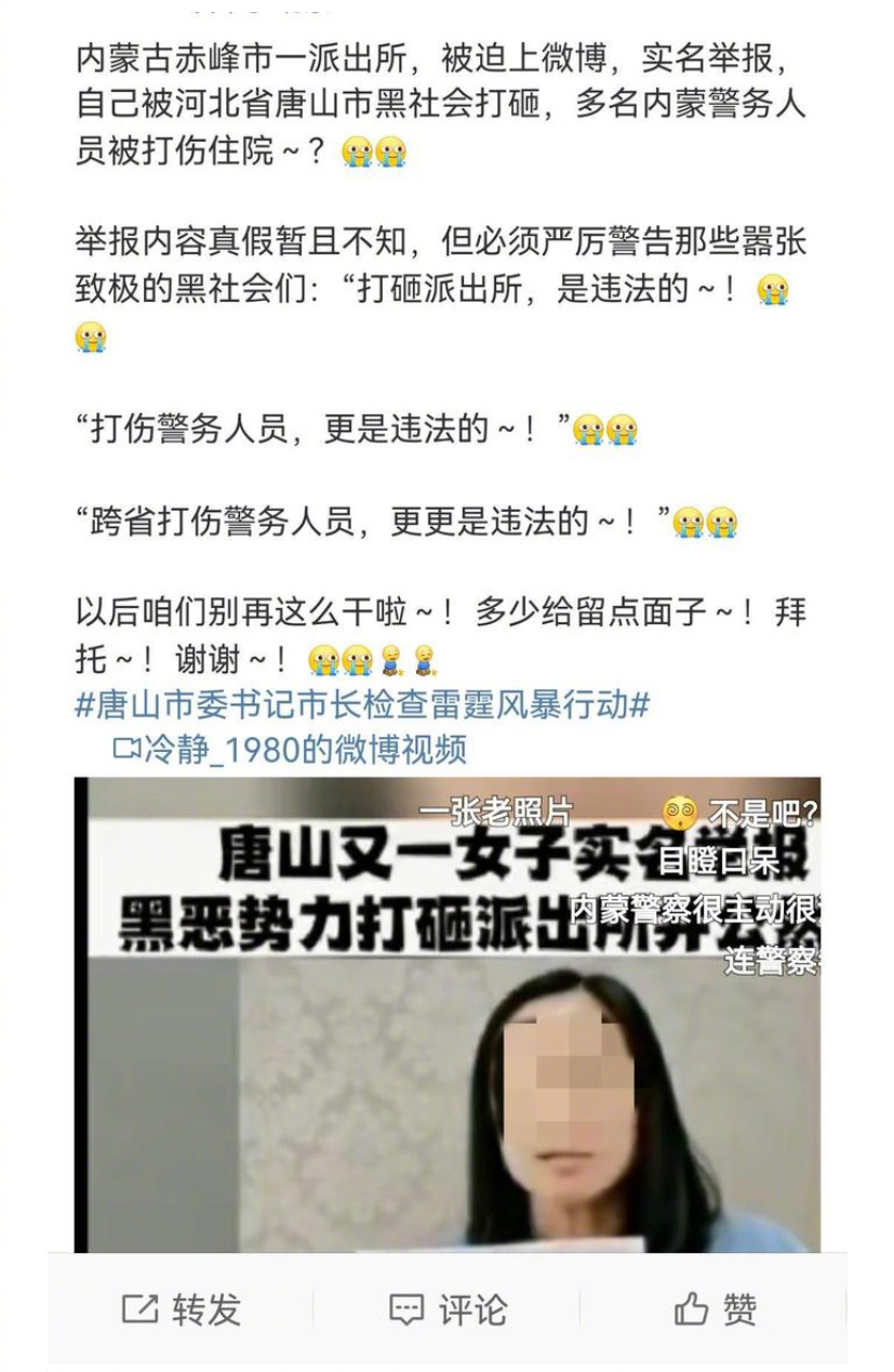 6月15日,网络上出现一段视频,内容显示,一名女子手持身份证,举报唐山某钢铁集团董事长带人,于2011年打砸赤峰市宁城县某派出所,导致办公用品损毁,3名民警受伤。