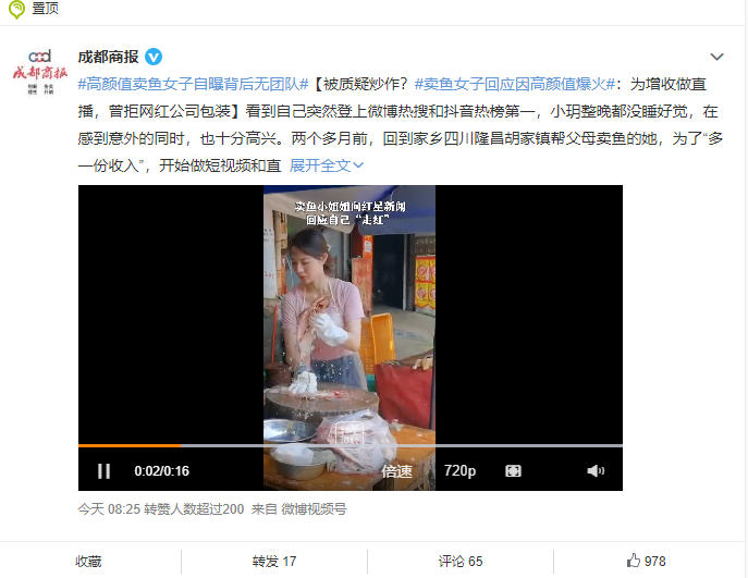 在网络走红的视频中,小玥杀鱼切片动作娴熟,众多网友因此力挺她,认为她是卖鱼的“老手”,如此技术“没几年练不出来”,她靠自己的劳动挣钱很美。