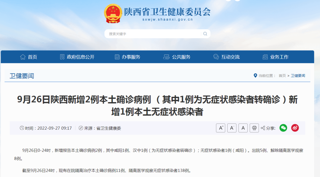 9月26日0-24时,新增报告本土确诊病例2例,其中咸阳1例、汉中1例(为无症状感染者转确诊);无症状感染者1例(咸阳)。出院5例、解除隔离医学观察8例。
