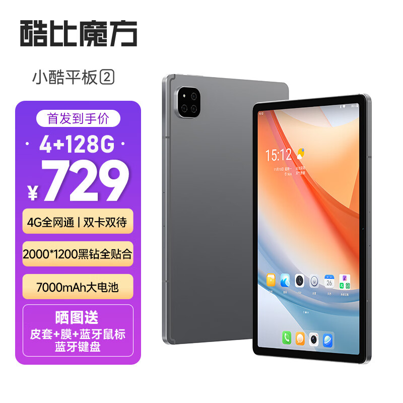 配置方面,小酷平板 2 搭载展锐T606 处理器,配有 4GB 内存和 128GB 存储空间,支持 4G 双卡双待全网通。小酷平板 2 配备了 AI 三摄摄像头,1600 万像素超清主摄,还包括微距、广角镜头;搭载 BOX 四扬声器,官方称联合大厂经过多次的调试,是酷比魔方有史以来最好的扬声器。电池容量为 7000mAh,支持 18W PD 充电。