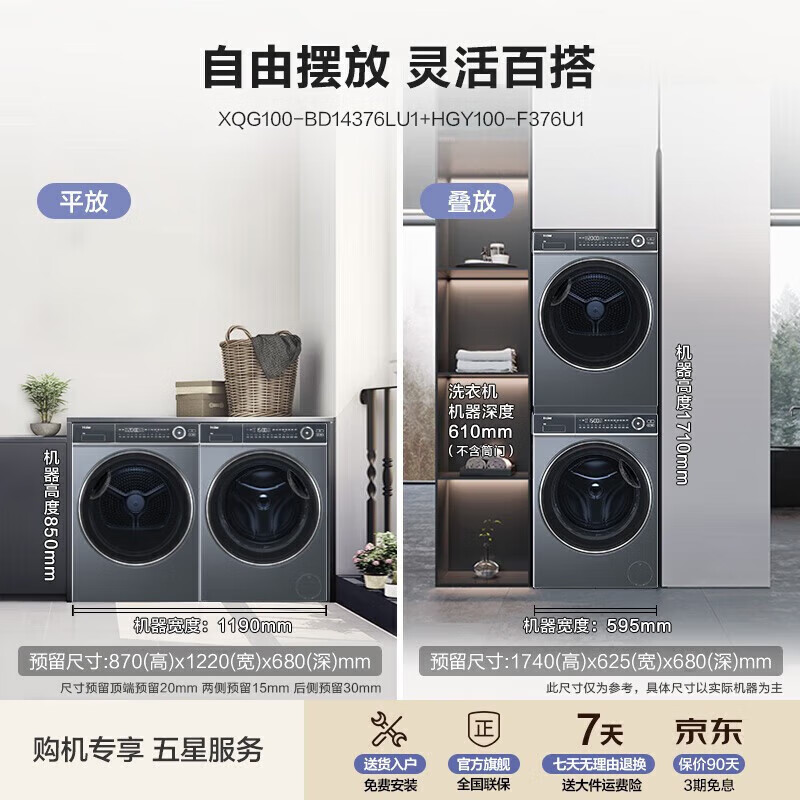海尔云溪系列 376 直驱智投洗衣机 +376热泵烘干机 组合套装 日常售价 12999 元。