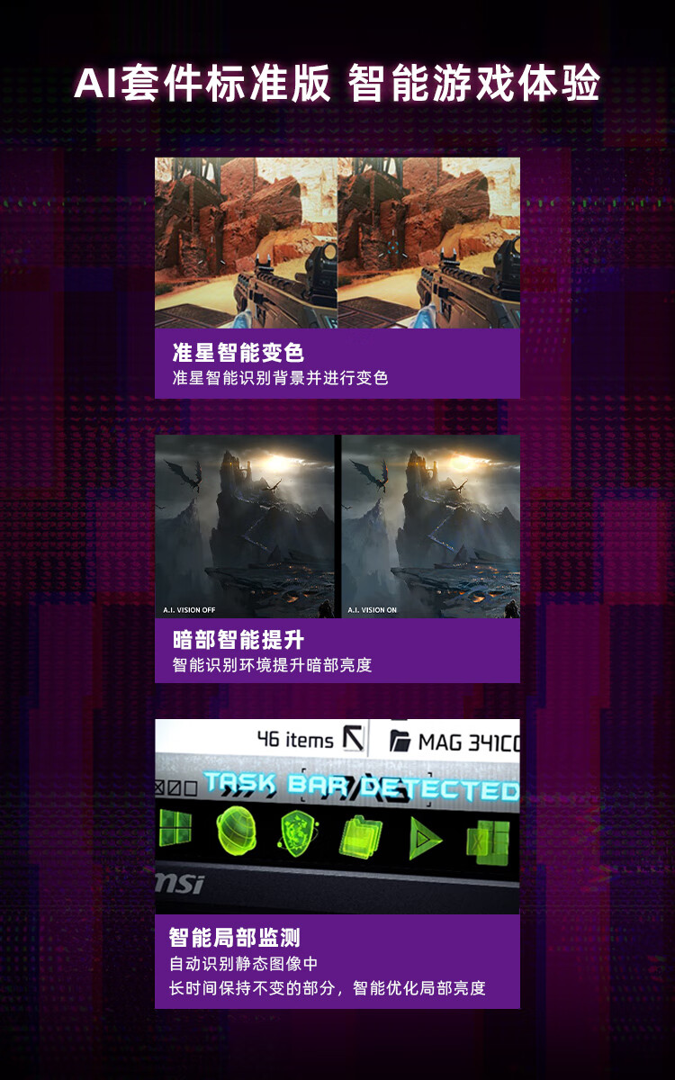 这款显示器支持准星智能变色、暗部智能提升、智能局部检测等 AI 功能。