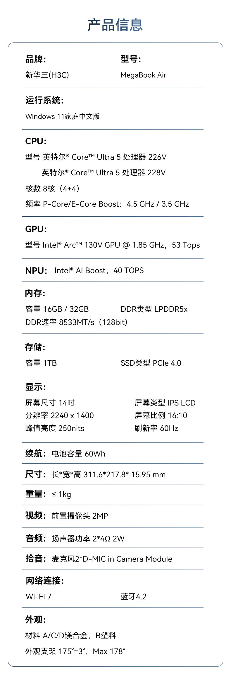 IT之家 4 月 30 日消息,新华三 H3C 上架了一款名为 MegaBook Air 的笔记本电脑,搭载英特尔 Lunar Lake 处理器,活动到手价 7999 元起: