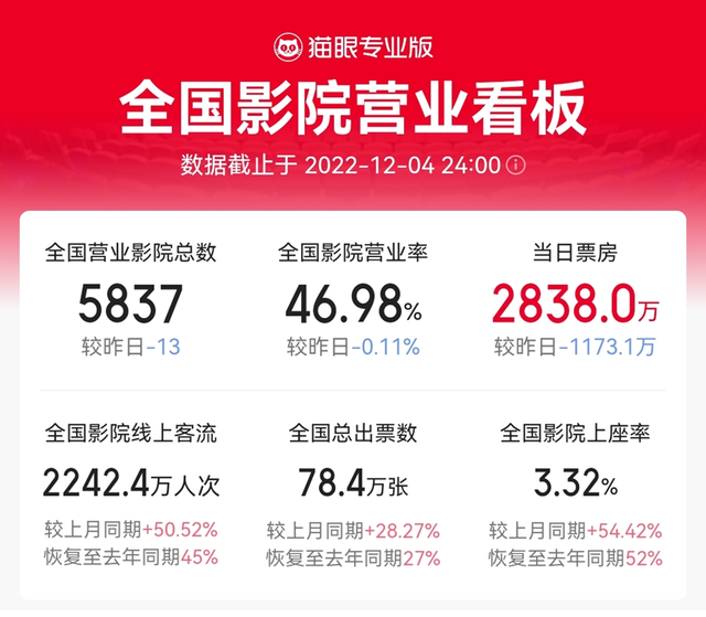 本文源自:证券时报网 证券时报记者 吴志 随着近期疫情防控措施进一步调整优化,多地电影院陆续恢复营业。全国影院营业率在一度跌破40%后,近期开始显著回升。 猫眼、灯塔平台数据显示, 12月4日,全国实现电影票房2833万元,当天全国共有营业影院5822家,影院营业率已逐步回升至约47%。 10月份以