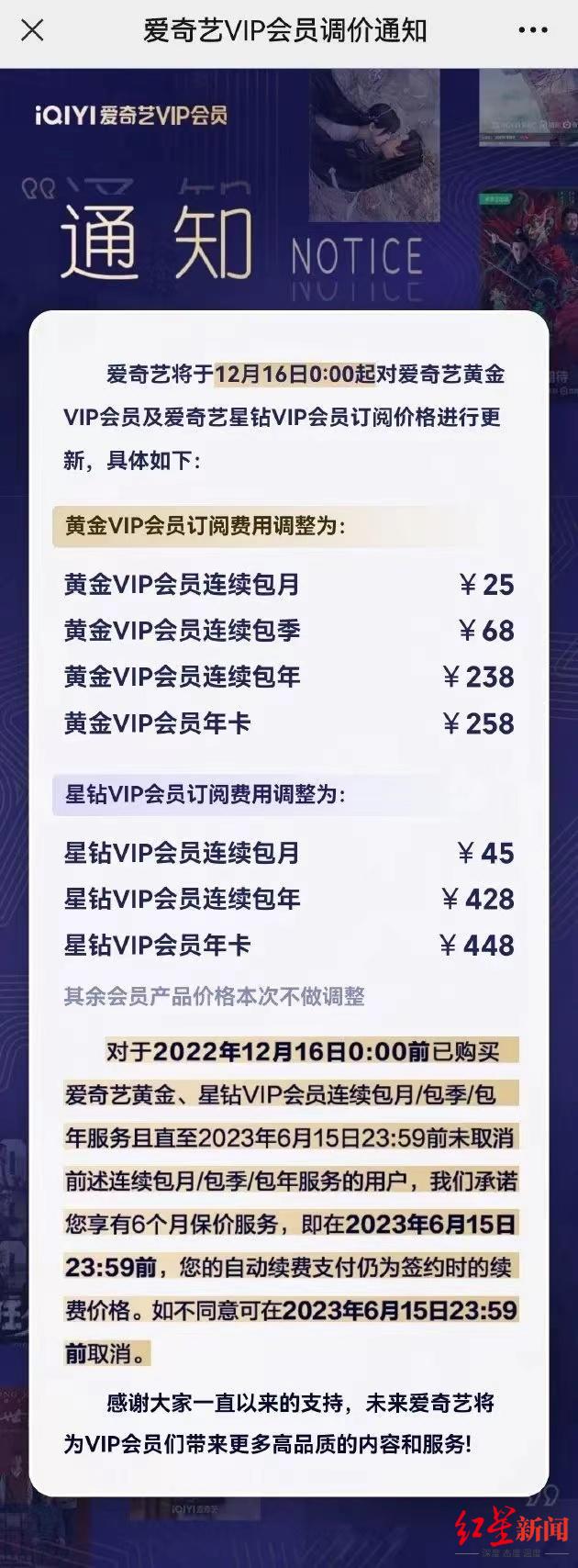 本报记者 李乔宇 见习记者 贺王娟《证券日报》记者从爱奇艺向用户发布的站内信获知,爱奇艺已于2022年12月16日零点起,启动新一轮价格调整。此次黄金会员价格调整涉及部分卡种,上涨3元至20元不等。今年4月,腾讯视频宣布二次涨价,其后优酷、芒果TV也相继调整了会员价格。大半年后爱奇艺发起这次调价,但