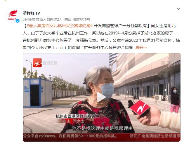 老人卖房为女儿买公寓,房子延期一年仍未交付!监管账户竟然一分钱都没有,开发商回应:"正常现象" 花了一辈子的积蓄买房,如果遇到有些开发商因为种种原因迟迟不肯交房,那才是让人焦心。湖北的闫大妈就遭遇到了这焦心的一幕。 据浙江电视台经济生活频道(浙样红TV)报道,近日,杭州群升商务中心延期交付近一年引