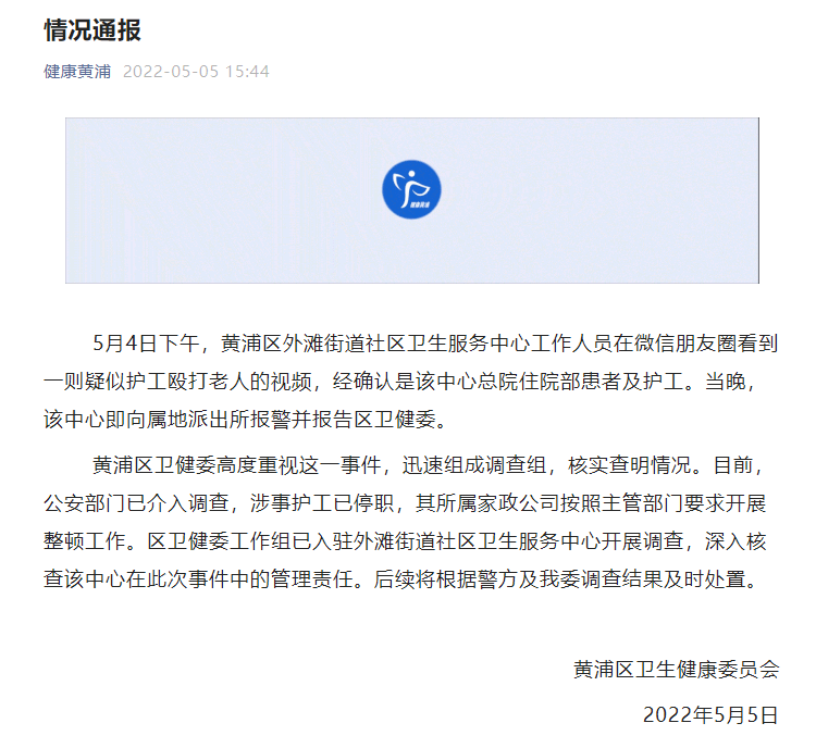 5日,上海市黄浦区卫健委发布情况通报称,5月4日下午,黄浦区外滩街道社区卫生服务中心工作人员在微信朋友圈看到一则疑似护工殴打老人的视频,经确认是该中心总院住院部患者及护工。当晚,该中心即向属地派出所报警并报告区卫健委。黄浦区卫健委高度重视这一事件,迅速组成调查组,核实查明情况。目前,公安部门已介入调
