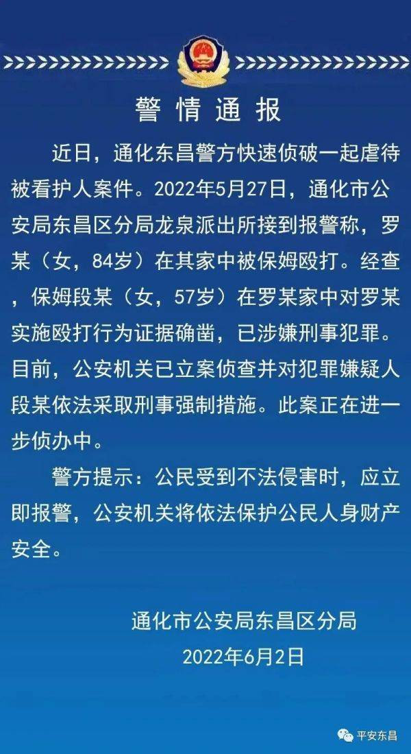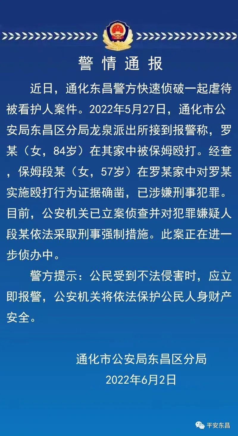6月3日,吉林通化市公安局东昌区分局发布警情通报: 近日,通化东昌警方快速侦破一起虐待被看护人案件。2022年5月27日,通化市公安局东昌区分局龙泉派出所接到报警称,罗某(女,84岁)在其家中被保姆殴打。经查保姆段某(女,57岁)在罗某家中对罗某实施殴打行为证据确凿,已涉嫌刑事犯罪。目前,公安机关已