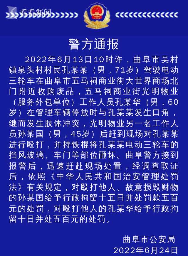 近日,山东曲阜,老人与物业发生口角遭殴打,所停电动三轮车遭打砸。 6月24日,曲阜公安通报称,2022年6月13日10时许,曲阜市吴村镇泉头村村民孔某某(男,71岁)驾驶电动三轮车在曲阜市五马祠商业街大世界商场北门附近收购废品,五马祠商业街光明物业(服务外包单位)工作人员孔某华(男,60岁)在管理车