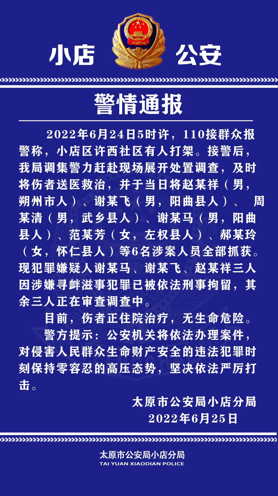 中新网山西新闻6月25日电 (记者 李庭耀) 6月25日,山西省太原市公安局小店分局发布警情通报称,该分局处置一起刑事案件,6名涉案人员全部抓获,伤者正住院治疗,无生命危险。(警情通报。 太原市公安局供图) 近日,一段关于“山西太原一老人当街遭殴打”的视频引发关注。 警情通报称,6月24日5时许,1