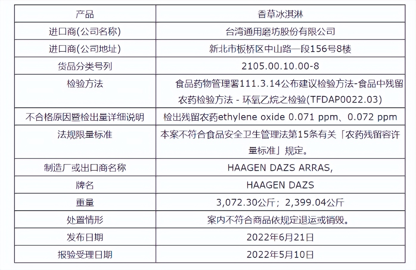 近日,商务部官网日前转载了一篇《法国出口哈根达斯香草冰淇淋被检出农药残留》的文章显示,2022年6月21日,台湾食药署发布边境查验不合格食品名单,其中法国出口两批次哈根达斯香草冰淇淋被发现含有极微量残留农药环氧乙烷。(图源:商务部官网)据了解,环氧乙烷是一种有机化合物,化学式是C(2)H(4)O,是