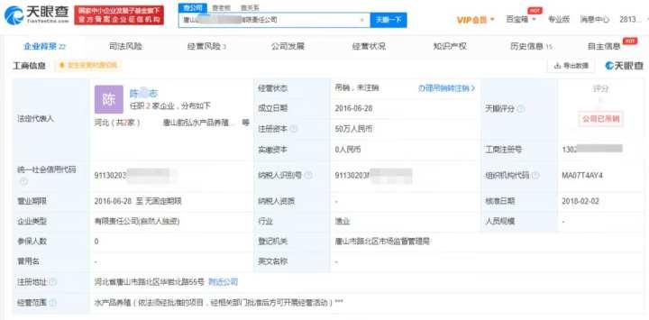 【#唐山打人者陈某志公司已被吊销执照#】6月10日,唐山打人事件引发全网关注。青岛广电·点时新闻报道,有当地市民曝出,其中一名施暴者为水产养殖老板陈某志。根据天眼查APP显示,陈某志关联的唐山韵红水产品养殖有限责任公司,因开业后自行停业连续六个月以上,于2021年3月25日被吊销执照。红星资本局6月