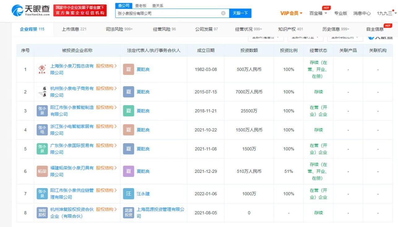 本文源自:金融界 近日,“张小泉菜刀因拍蒜断了”事件持续引发关注。张小泉相关负责人回应称,公司可能会研发专门用来拍蒜的刀 。有网友发现,在此前的采访中,张小泉总经理曾称中国人切菜方法不对。 天眼查App显示,张小泉股份有限公司成立于2008年9月,2021年9月上市,注册资本1.56亿,法定代表人