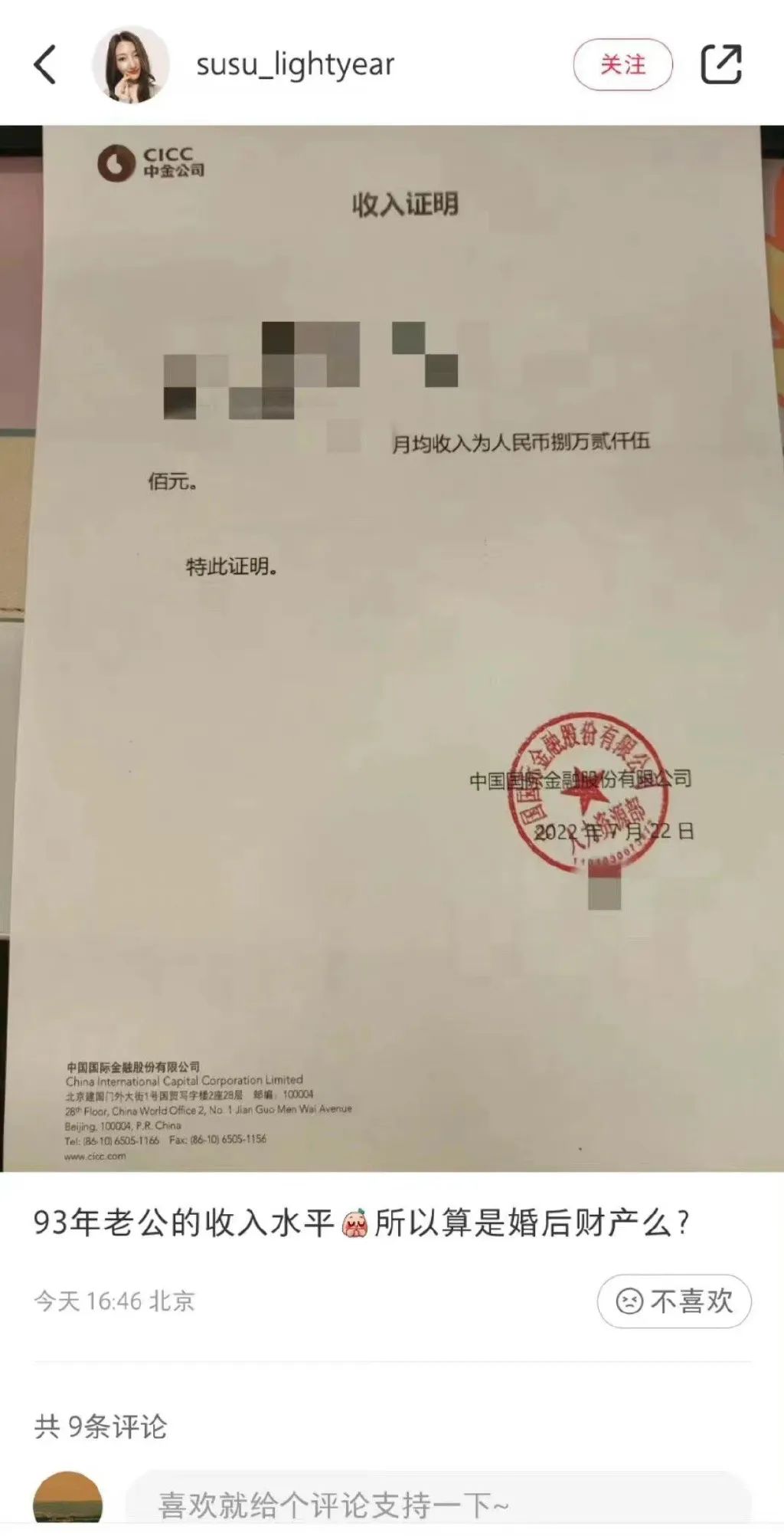 28日晚间,一则 “90后券商交易员月入超8万” 相关截图在社交平台疯传 图片显示 有博主晒出其丈夫收入及两人合照 并配上由中金公司开具的 “月均收入为82500元”收入证明 图片配文称: “93年老公的收入水平 所以算婚后财产吗?” 对此 中金公司相关负责人回应称: “该事件已引起中金公司重视 涉