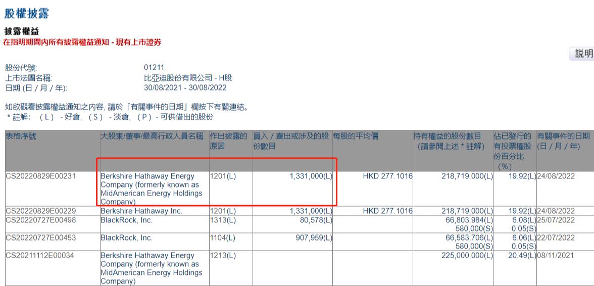 金融界8月30日消息 14年来首次卖出! 今日晚间,港交所文件披露,伯克希尔哈撒韦公司在8月24日出售了133万股比亚迪H股,平均价格277.1港元/股,在比亚迪的持股比例降至19.92%。 在今年2月26日晚间,“股神”沃伦·巴菲特旗下公司伯克希尔·哈撒韦公布了2021年四季度和全年财报。 据