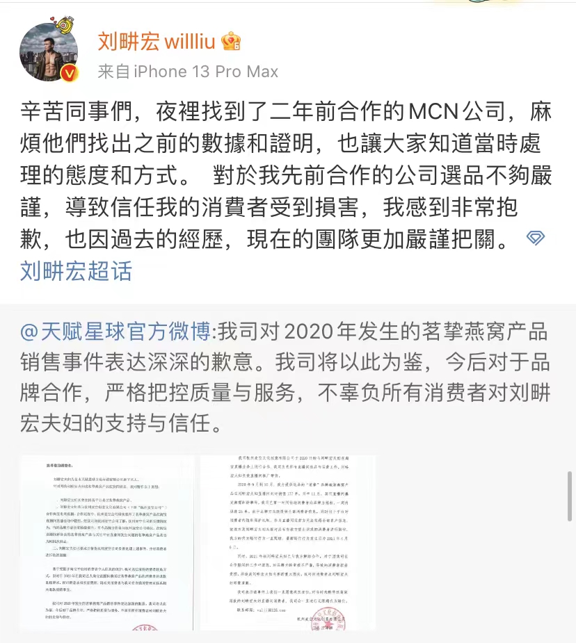 8月30日晚,“辛巴发长文爆料刘畊宏夫妇卖假货”热搜第一。辛巴在某直播平台发长文,再次详细讲述了之前引起争议的卖“假燕窝”事件。他有些愤愤不平地表示,很多网红明星都曾卖过同款燕窝,其中还包括现在正当红的刘畊宏,他也为给消费者带来了不好的消费体验而再次道歉。对此,31日,刘畊宏发文道歉,他表示昨天夜里