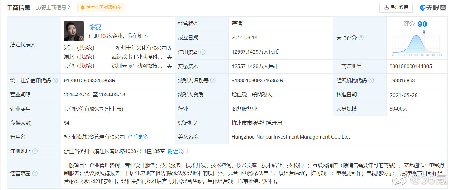 【#南派三叔公司1547万股权被冻结#】企查查APP显示,近日,杭州量子泛娱影视文化传媒股份有限公司新增股权冻结信息,冻结数额1547万元人民币。企查查信息显示,该公司成立于2014年3月,董事长、法定代表人为徐磊(南派三叔),注册资本约1.26亿元,经营范围包括企业管理咨询、文艺创作、电视剧制作等