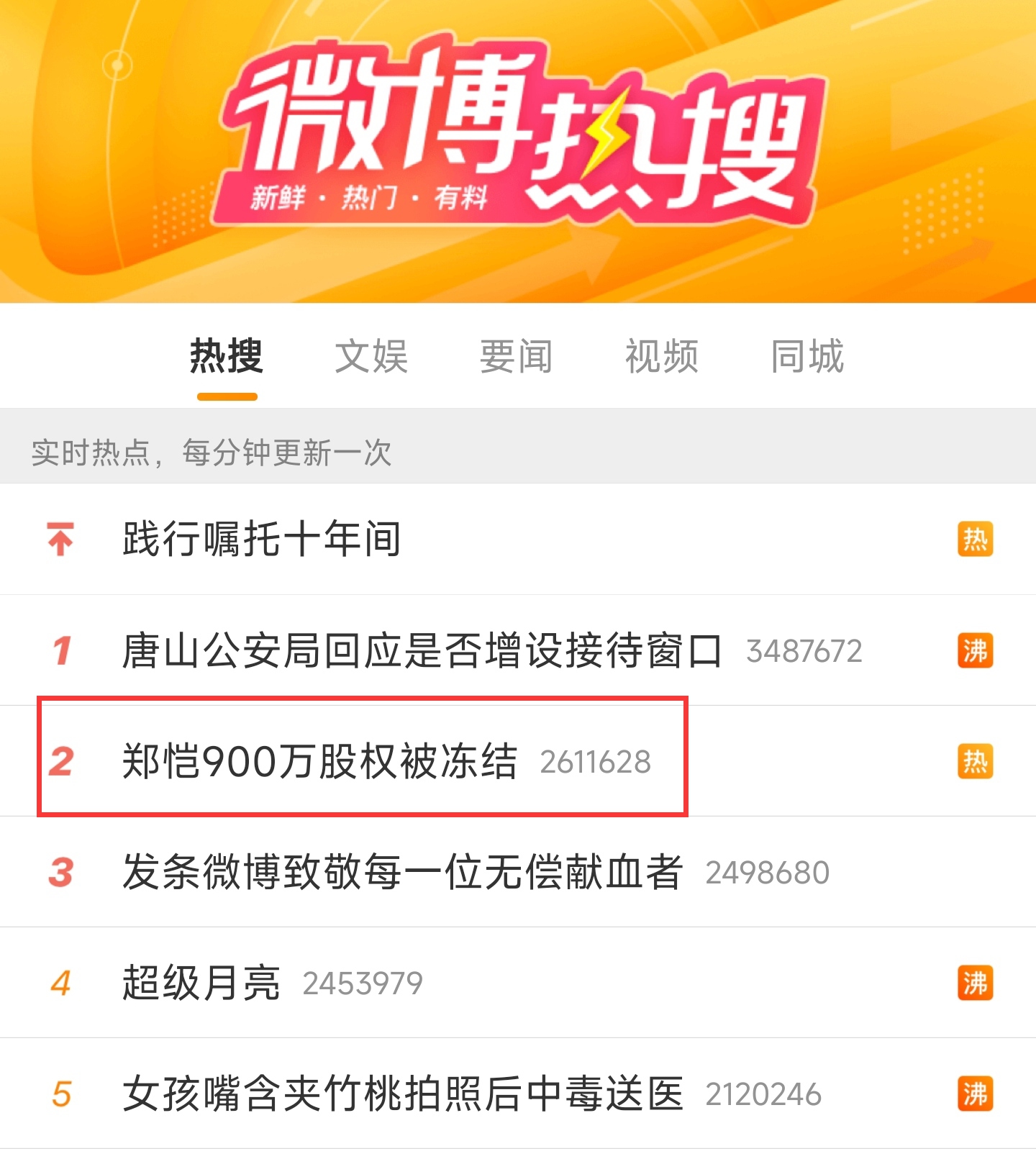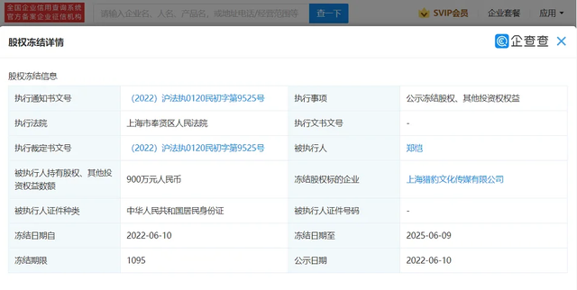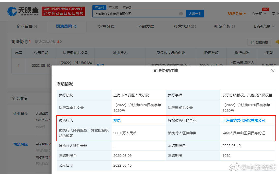 中新经纬6月14日电 “郑恺900万股权被冻结”登上热搜!截图来源:微博 据国家企业信用信息公示系统显示,近日,上海猎豹文化传媒有限公司(下称“猎豹文化”)新增股权冻结信息,郑恺为被执行人,冻结股权数额为900万元,冻结期限自2022年6月10日至2025年6月9日。截图来源:国家企业信用信息公示系