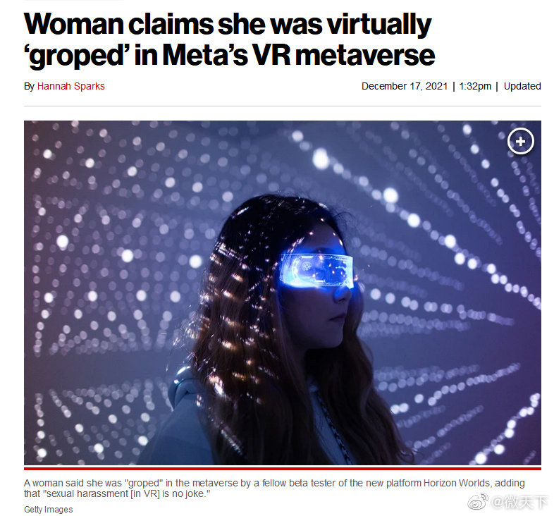 【#女子称在元宇宙中被性骚扰#】据《纽约邮报》,近日,脸书“元宇宙”的一位测试用户称自己在“元宇宙”中被性骚扰,这么女子称自己在地平线世界被一个陌生人摸了一把。她写道:“昨晚我不仅被人摸了,而且还有其他人支持这种行为,这让我在虚拟世界中感到孤立。” 上周,元宇宙开放了其虚拟现实社交媒体平台Horiz