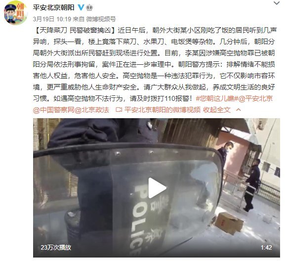 近日午后,朝外大街某小区刚吃了饭的居民听到几声异响,探头一看,楼上竟落下菜刀、水果刀、电饭煲等杂物。几分钟后,朝阳分局朝外大街派出所民警赶到现场进行处置。目前,李某因涉嫌高空抛物罪已被朝阳分局依法刑事拘留,案件正在进一步审理中。 朝阳警方提示:排解情绪不能损害他人权益,危害他人安全。高空抛物是一种违