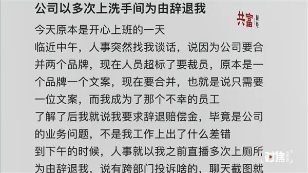近日,广州的林女士发文称,自己因生理期多次上厕所,被公司在即将转正的时候辞退,而且拒绝赔偿。 林女士发文截图林女士给出的微信聊天记录显示,领导称在工作中经常找不到林女士本人,快要开始直播了还打不通电话,被其他领导跨部门投诉了。 林女士解释说,自己正处于经期,需要频繁更换卫生巾,同时自己是文案策划,并