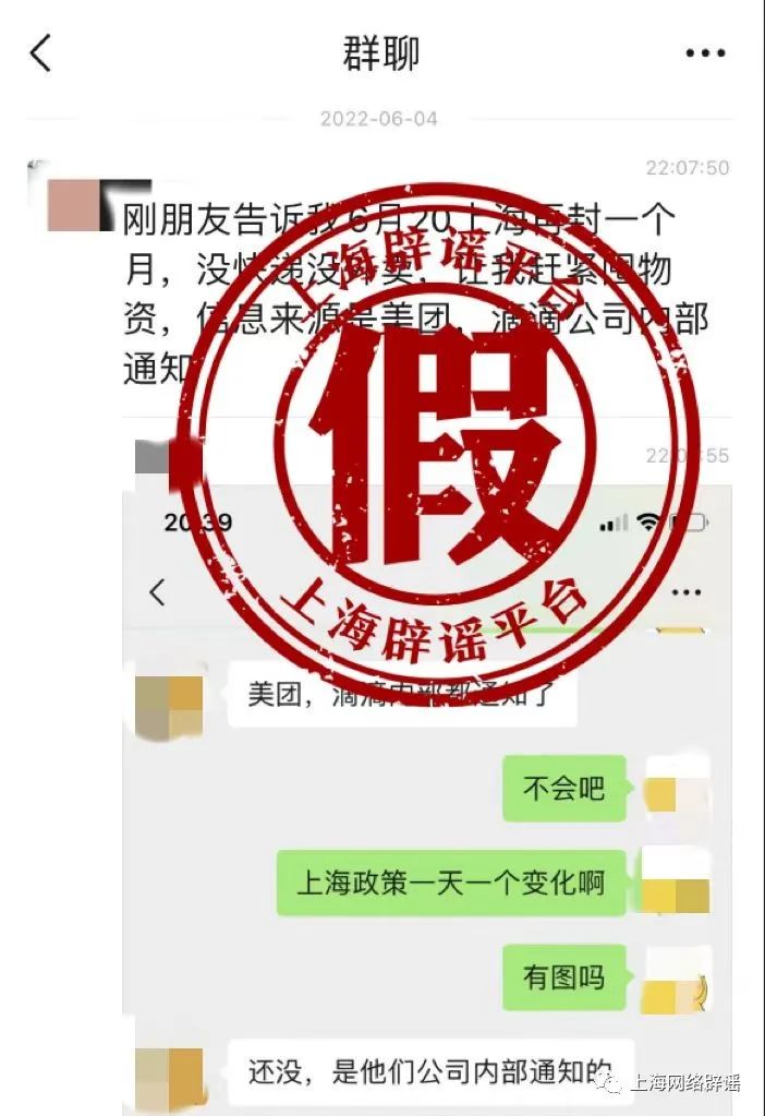 近日,微信圈群有传言称“6月20日上海再封一个月,没快递没外卖……信息来源是美团、滴滴公司内部通知”。上海辟谣平台向上海市新冠肺炎疫情防控工作领导小组办公室(简称“市防控办”)求证获悉,传言不实。全市目前没有这个安排。 另外,根据警方的溯源调查,相关合并聊天记录里,发布信息的朱某就职于某餐饮管理有限