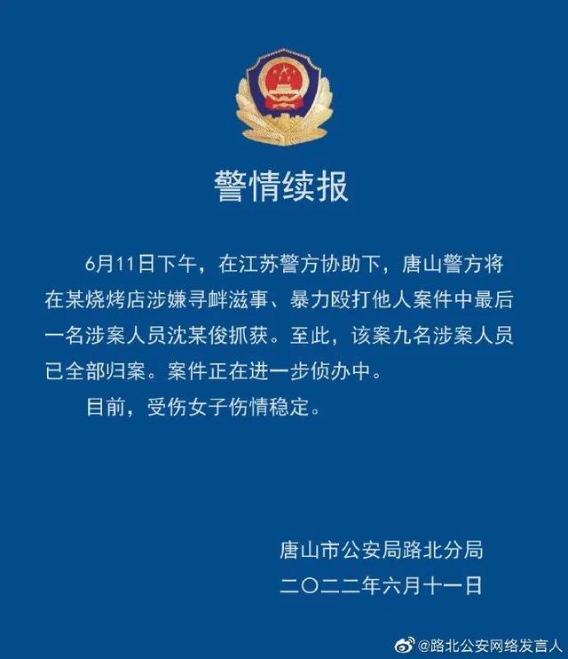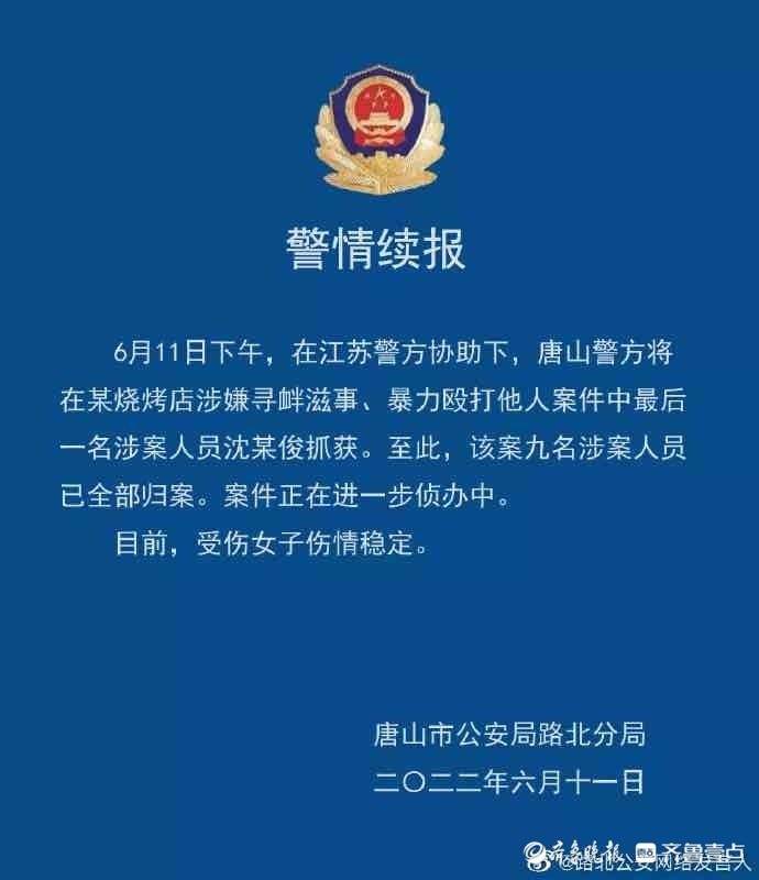 来源|都市现场综合法制日报、路北公安网络发言人 据河北省唐山市路北公安网络发言人 6月11日14:26发布的最新通报: 6月11日下午,在江苏警方协助下,唐山警方将在某烧烤店涉嫌寻衅滋事、暴力殴打他人案件中最后一名涉案人员沈某俊抓获。至此,该案九名涉案人员已全部归案。案件正在进一步侦办中。目前,受伤