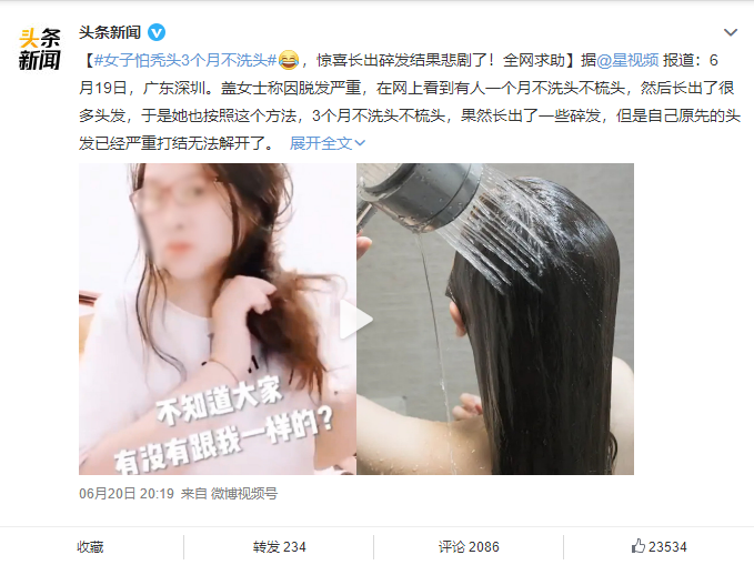 今天 #女子怕秃头3个月不洗头# 的话题登上热搜榜 引来上亿网友围观网页截图 报道称 广东一女子因脱发严重 在网上看到有人一个月不洗头不梳头 然后长出了很多头发 于是她也按照这个方法 3个月不洗头不梳头 果然长出了一些碎发 但是自己原先的头发 已经严重打结无法解开了网页截图 对此 有网友表示 为了不