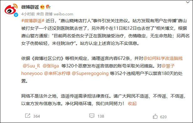 据媒体报道,6月10日凌晨,在河北唐山一家烧烤店门口发生一起暴力打人事件,疑似男子搭讪女子失败引发肢体冲突。该视频引发网友热议。据@微博辟谣 消息,近日,“唐山烧烤店打人”事件引发关注热议。站方发现有用户在传播“唐山被打女子一个还没到医院就去世了,另外两个在11日和12日也去世了”相关博文,根据唐山