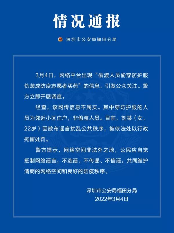 文/羊城晚报全媒体记者 郭起 据深圳市公安局福田分局通报,3月4日,网络平台出现“偷渡人员偷穿防护服伪装成防疫志愿者买药”的信息,引发公众关注。警方立即开展调查。 经查,该网传信息不属实。其中穿防护服的人员为邻近小区住户,非偷渡人员。目前,刘某(女,22岁)因散布谣言扰乱公共秩序,被依法处以行政拘留