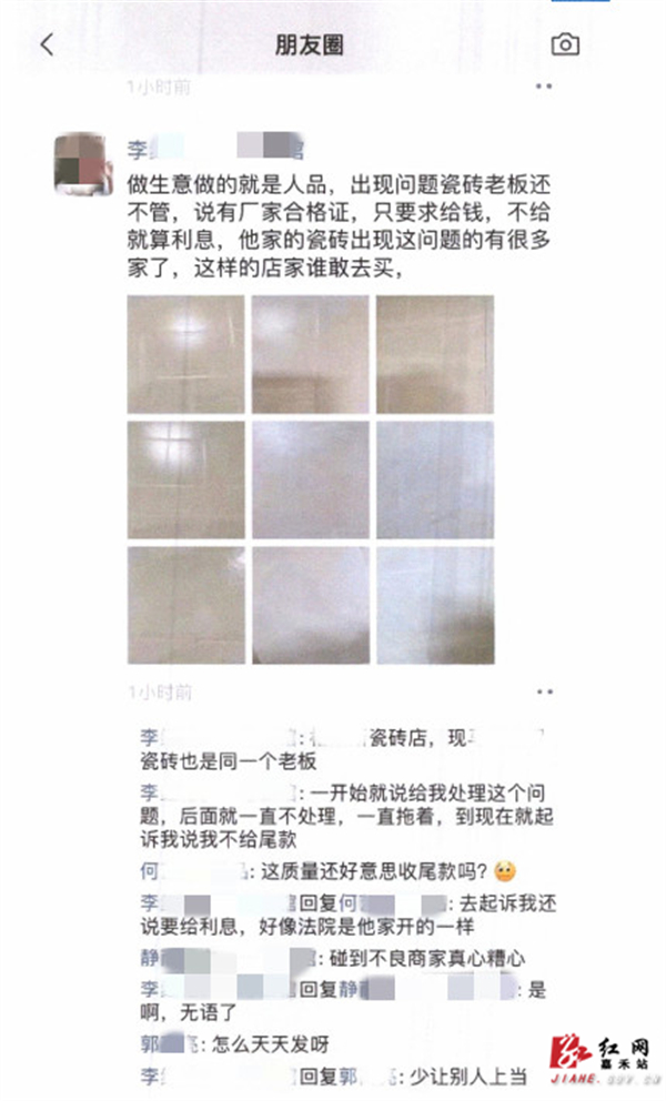 红网嘉禾分站(通讯员 雷丰利)近日,嘉禾县人民法院审理了一起因发微信朋友圈“吐槽”商家而引发的名誉权纠纷案件。 2018年4月,L女士在B商贸公司购买了A品牌瓷砖,但一直欠有部分款项未支付。2021年6月,B商贸公司将L女士诉至嘉禾县人民法院,诉请L女士支付瓷砖款本息,然而双方协商未果。 2021年