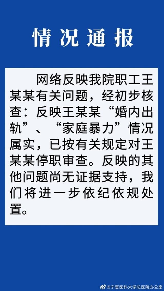24日凌晨,@宁夏医科大学总医院办公室 通报:网络反映我院职工王某某有关问题,经初步核查:反映王某某“婚内出轨”、“家庭暴力”情况属实,已按有关规定对王某某停职审查。反映的其他问题尚无证据支持,我们将进一步依纪依规处置。此前,女子实名举报医师丈夫宁夏医科大学总院王某某收受医药代表回扣、婚内出轨家暴等