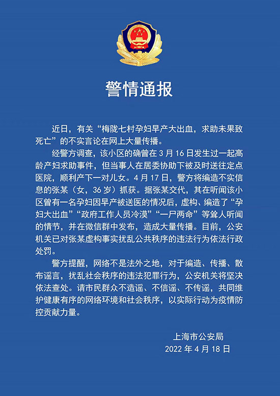 本文转自:人民网 人民网上海4月18日电 (王文娟)据上海市公安局通报,近日,有关“梅陇七村孕妇早产大出血,求助未果致死亡”的不实言论在网上大量传播。 经警方调查,该小区的确曾在3月16日发生过一起高龄产妇求助事件,但当事人在居委协助下被及时送往定点医院,顺利产下一对儿女。4月17日,警方将编造不实