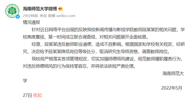 5月27日,海南师范大学针对段某某的事件发布情况通报。全文如下:针对近日网络平台出现的反映我校新闻传播与影视学院教师段某某的相关问题,学校高度重视,第一时间成立联合调查组,对相关问题展开全面核查。经查,段某某违反教师职业道德,造成不良影响。根据国家和学校有关规定,经研究,决定给予段某某降低岗位等级处
