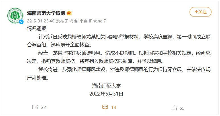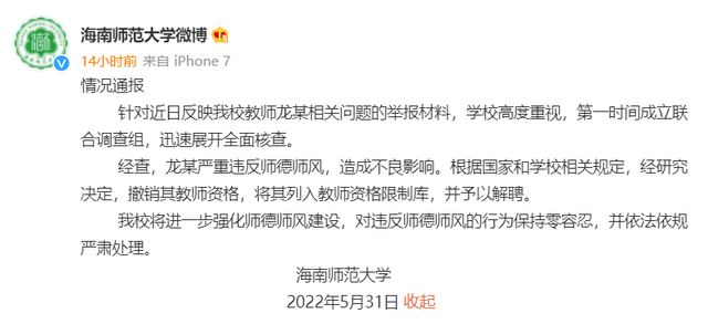 日前,有网友举报称,海南师范大学国际教育学院教授龙某曾以“长见识”为由将其带离学校强制猥亵,放言称“你已经是老子的女人了”,还威胁其删除手机上有关信息。5月31日晚,@海南师范大学微博 发布相关通报:针对近日反映我校教师龙某相关问题的举报材料,学校高度重视,第一时间成立联合调查组,迅速展开全面核查。