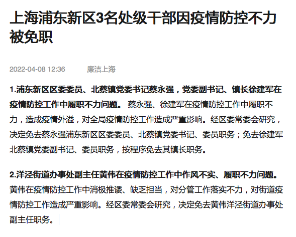 【#上海浦东3名干部防疫不力被免职#】据@廉洁上海 :1.浦东新区区委委员、北蔡镇党委书记蔡永强,党委副书记、镇长徐建军在疫情防控工作中履职不力问题。蔡永强、徐建军在疫情防控工作中履职不力,造成疫情外溢,对全局疫情防控工作造成严重影响。经区委常委会研究,决定免去蔡永强浦东新区区委委员、北蔡镇党委