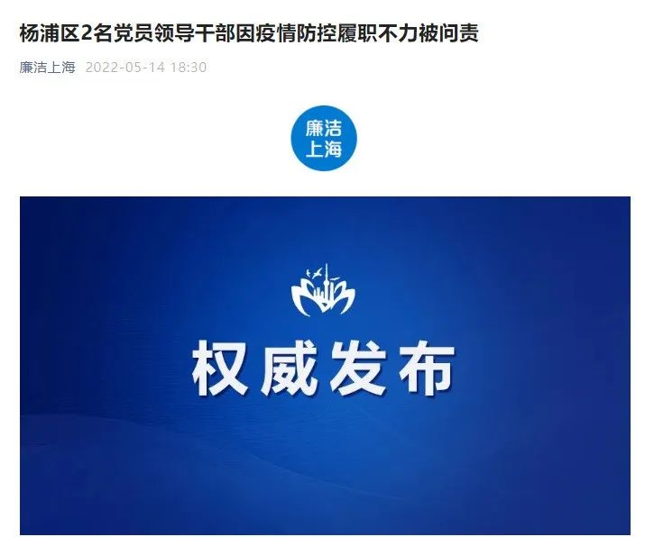 刚刚 “廉洁上海”微信号通报 ↓↓↓ 杨浦区2名党员领导干部 因疫情防控履职不力被问责 杨浦区控江路街道在组织转运密接人员过程中,工作不实不细,对密接人员到达隔离点后无法按计划入住,并造成严重不良影响负有责任。 该街道党工委副书记、办事处主任孟焱和党工委委员、办事处副主任瞿佳欢被党纪立案,接受进一步