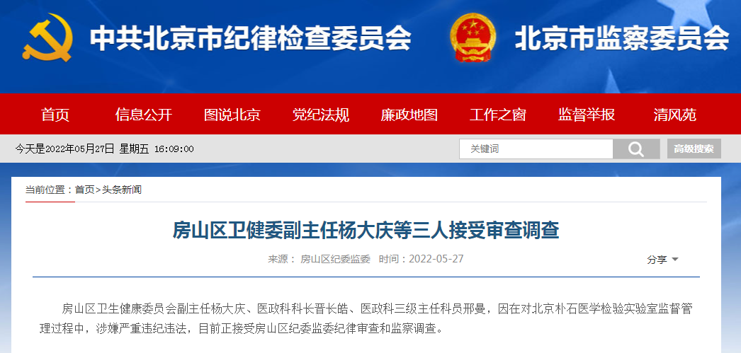 5月27日,北京市纪委监委网站发布消息,房山区卫生健康委员会副主任杨大庆、医政科科长晋长皓、医政科三级主任科员邢曼,因在对北京朴石医学检验实验室监督管理过程中,涉嫌严重违纪违法,目前正接受房山区纪委监委纪律审查和监察调查。 房山区政府网站显示,杨大庆出生于1969年8月,曾任霞云岭乡卫生院院长,张坊