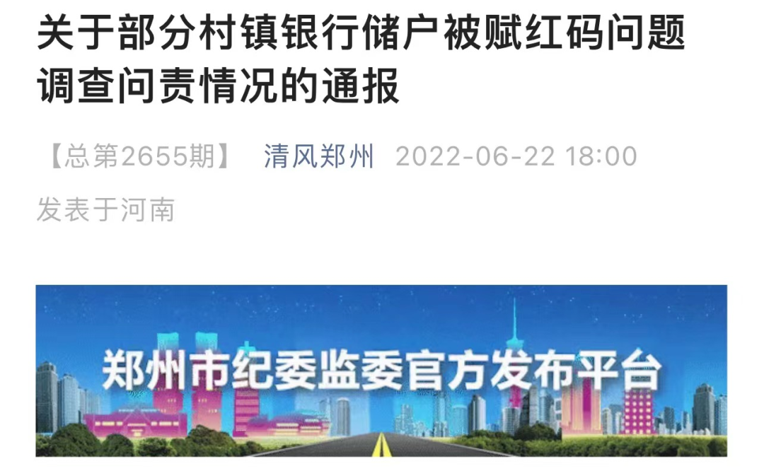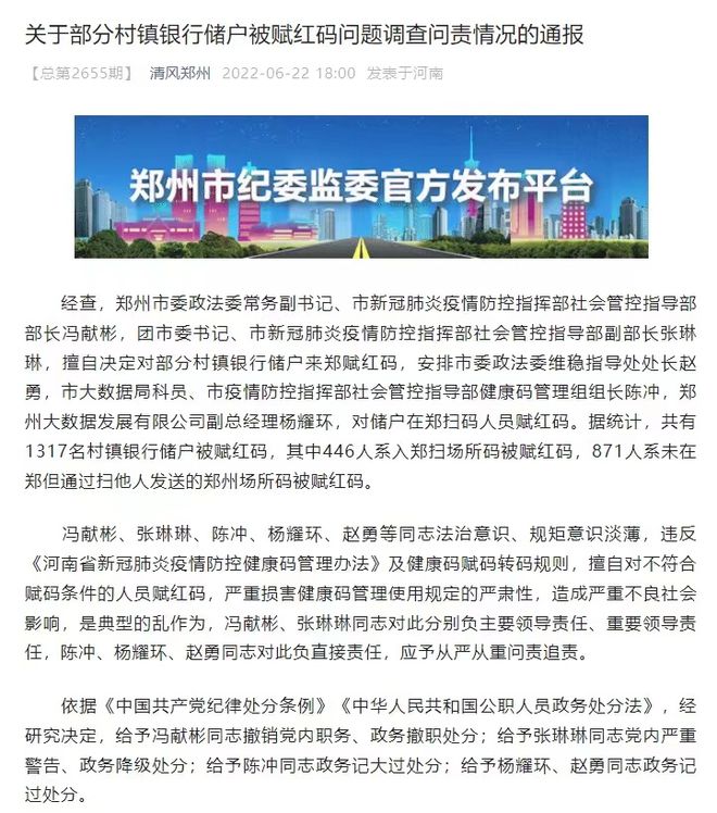 6月22日,郑州市纪律检查委员会微信公众号发布《关于部分村镇银行储户被赋红码问题调查问责情况的通报》指出,经查,郑州市委政法委常务副书记、市新冠肺炎疫情防控指挥部社会管控指导部部长冯献彬,团市委书记、市新冠肺炎疫情防控指挥部社会管控指导部副部长张琳琳,擅自决定对部分村镇银行储户来郑赋红码,安排市委政
