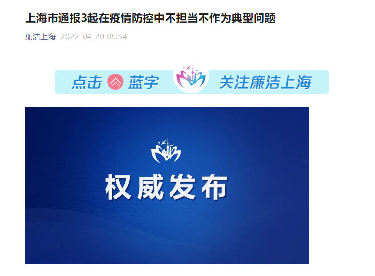 4月7日,上海市纪委监委通报2起疫情防控不力典型问题: 1.上海机场集团下属虹桥公司消防急救保障部原党委副书记、总经理李水飞在疫情防控中不担当、不作为问题。李水飞在3月24日紧急转送一名机场委外单位新冠肺炎核酸检测阳性员工过程中,消极推诿、缺乏担当,导致转运进程迟滞,造成不良影响,被撤销党内职务和行