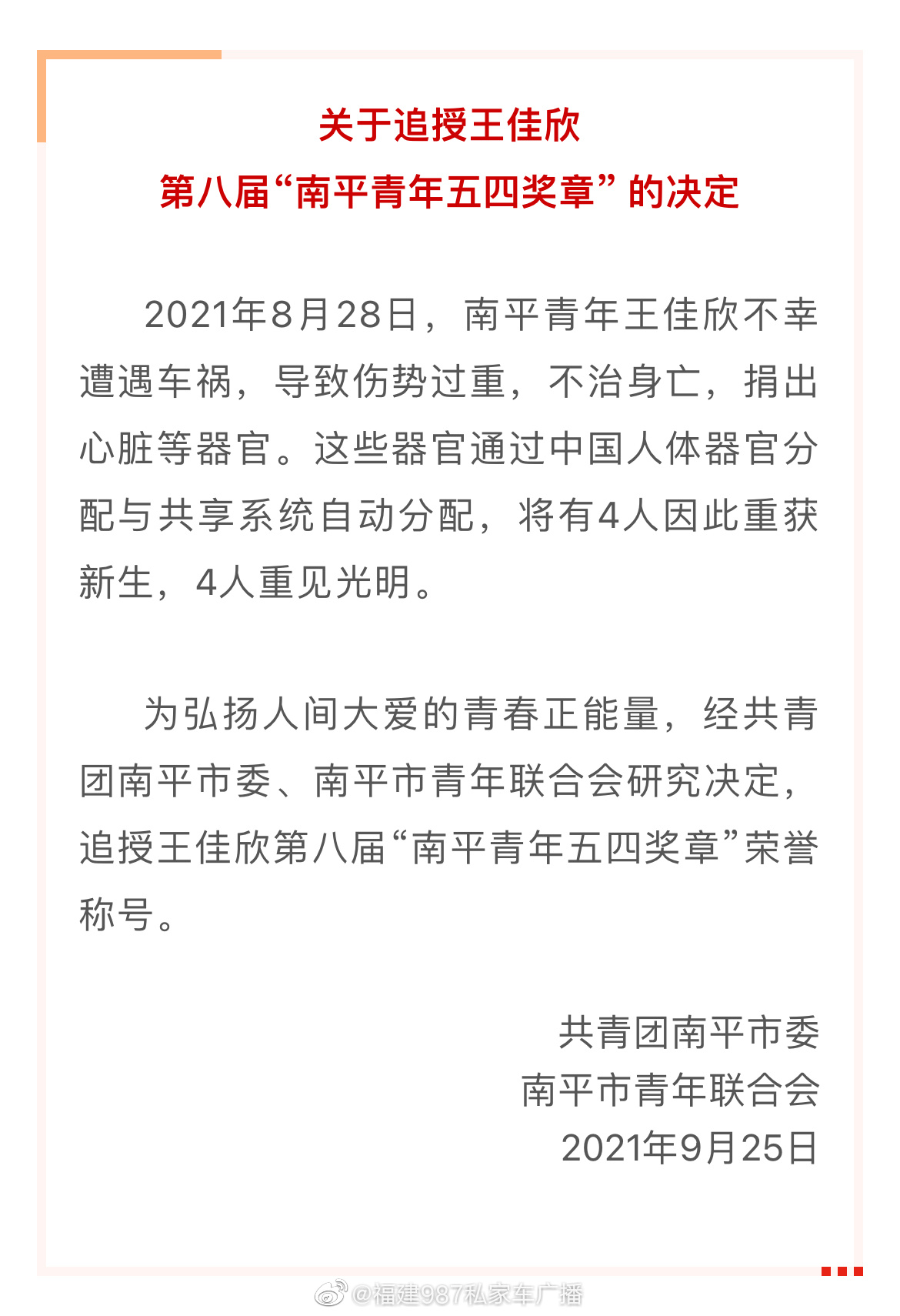 【#王佳欣被追授青年五四奖章# 亲爱的佳欣,谢谢你[心]】2021年8月28日,南平青年王佳欣不幸遭遇车祸,导致伤势过重,不治身亡,捐出心脏等器官。这些器官通过中国人体器官分配与共享系统自动分配,将有4人因此重获新生,4人重见光明。#福建女大学生车祸离世捐器官救8人#为弘扬人间大爱的青春正能量,经共