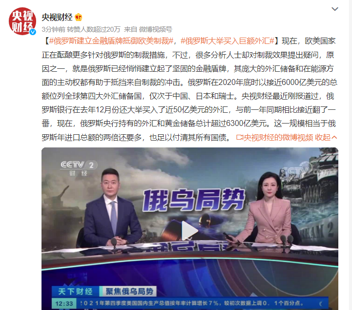 俄罗斯大举买入巨额外汇,建立金融盾牌抵御欧美制裁 现在,欧美国家正在酝酿更多针对俄罗斯的制裁措施,不过,很多分析人士却对制裁效果提出疑问,原因之一,就是俄罗斯已经悄悄建立起了坚固的金融盾牌,其庞大的外汇储备和在能源方面的主动权都有助于抵挡来自制裁的冲击。 俄罗斯在2020年底时以接近6000亿美元的