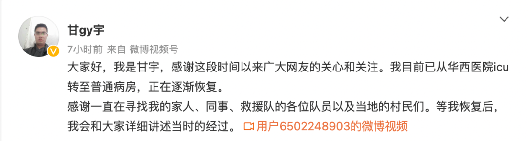 1905电影网专稿 “大家好,我是甘宇,感谢这段时间以来广大网友的关心和关注。我目前已从华西医院icu转至普通病房,正在逐渐恢复。” 9月26日,甘宇发布微博透露最新身体状况,让全国牵挂他的亿万网友松了一口气。 在9·5泸定地震中,甘宇和同事罗永放弃第一时间逃生,选择坚守水电站,拉闸泄洪,成功避免下