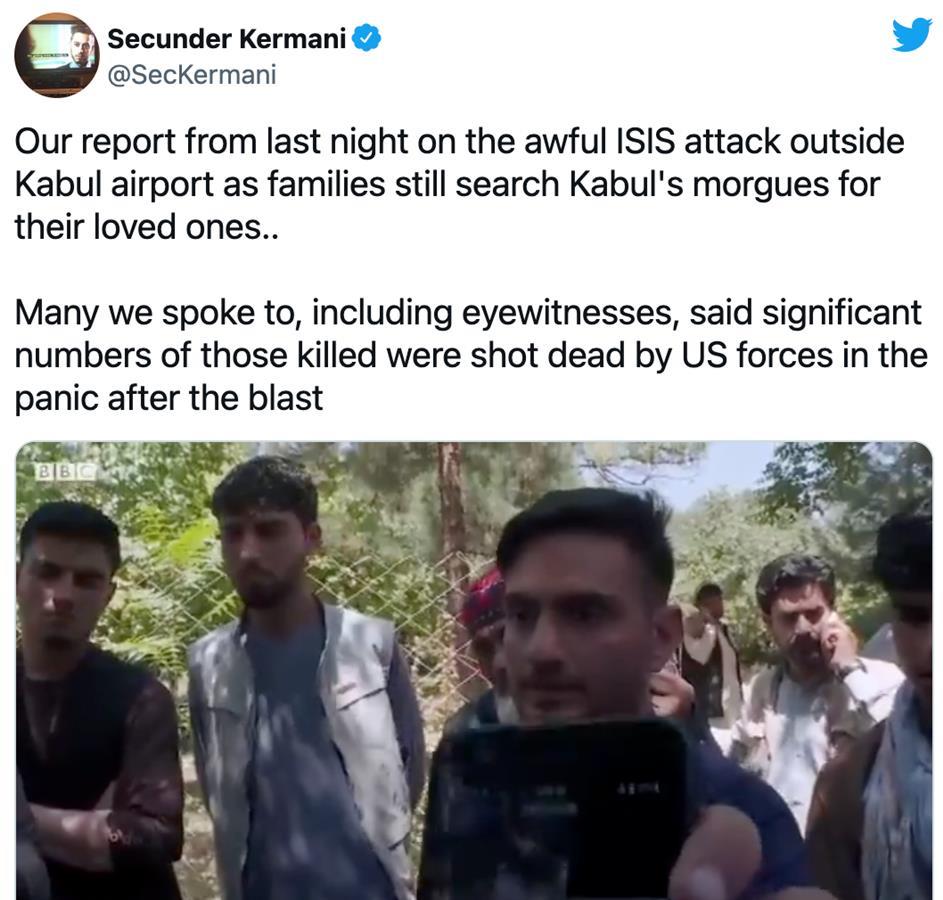 极目新闻记者 宋清影 8月27日喀布尔机场爆炸恐怖袭击造成了至少170人死亡,但据外媒报道,恐袭中丧生的平民并非都死于爆炸,有大量平民是在混乱中被美军射杀的。 据BBC报道,来自伦敦的出租车司机穆罕默德此前曾前往喀布尔,帮助他的家人撤离。8月27日喀布尔机场爆炸发生后,穆罕默德和妻子在喀布尔机场的附