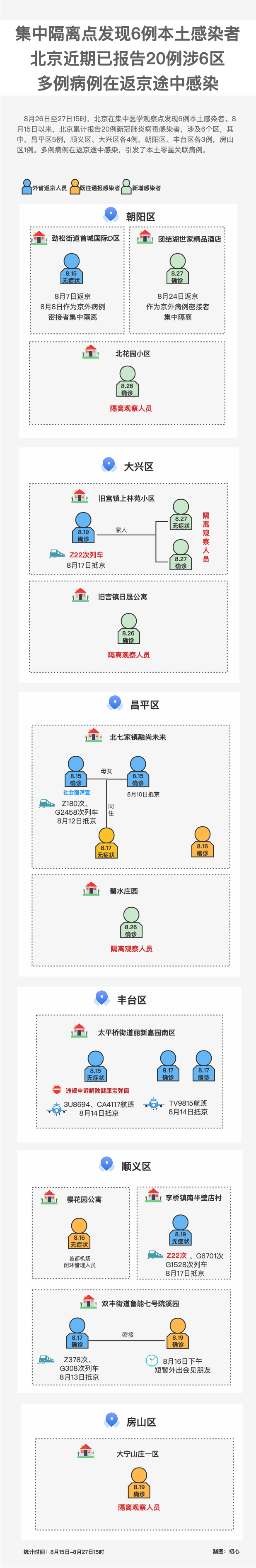 北京日报微信公众号 | 记者 张力 8月26日至27日15时 北京在集中医学观察点 发现6例本土感染者 8月15日以来 北京已累计报告20例 本土新冠肺炎感染者 涉及6个区: 昌平区5例、房山区1例 顺义区、大兴区各4例 朝阳区、丰台区各3例 多例病例在返京途中感染 引发了本土零星关联病例 ↓↓↓