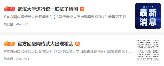 7月10日,网上有消息称7月9日晚,武汉大学工学部宿舍疑似发现一例霍乱,并且全栋学生都进行了统一肛拭子检测。随后,记者在采访了武汉大学医务室及武昌区卫生健康委员会后获悉,检测结果目前还未出炉。 10日,有网友报料称,武汉大学工学部宿舍疑似发现一例霍乱,并且校方也发布了相应的通知。对此,武昌区卫生健康