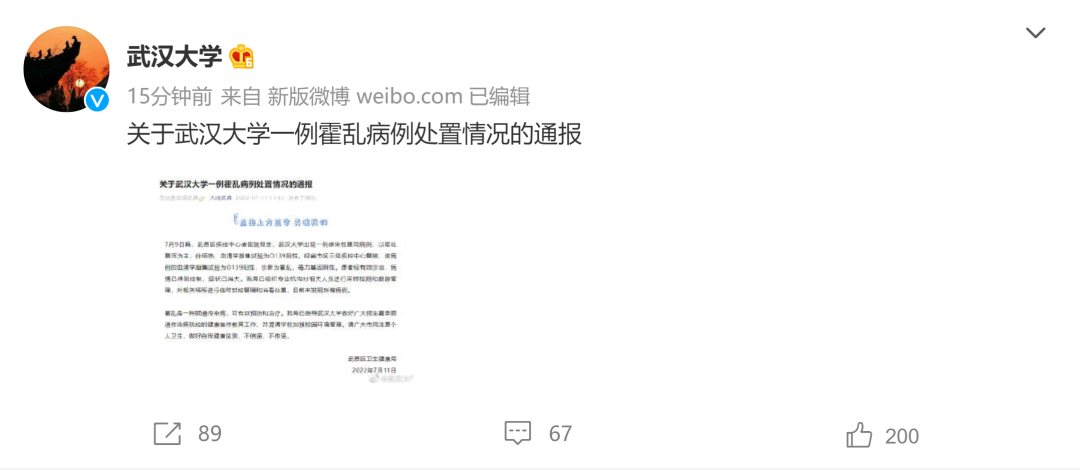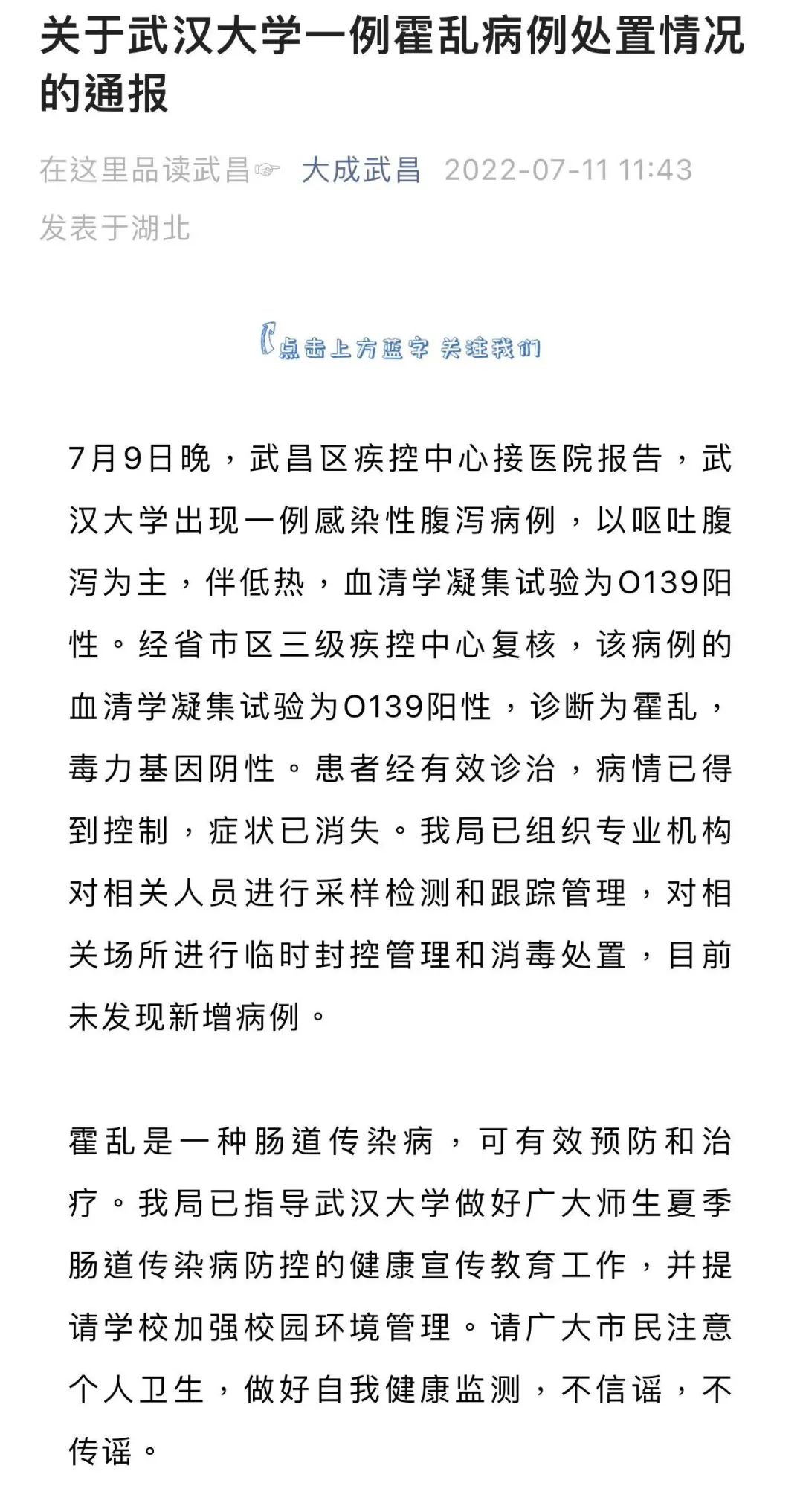 武汉市武昌区卫生健康局发布关于武汉大学一例霍乱病例处置情况的通报。 7月9日晚,武昌区疾控中心接医院报告,武汉大学出现一例感染性腹泻病例,以呕吐腹泻为主,伴低热,血清学凝集试验为O139阳性。经省市区三级疾控中心复核,该病例的血清学凝集试验为O139阳性,诊断为霍乱,毒力基因阴性。患者经有效诊治,病