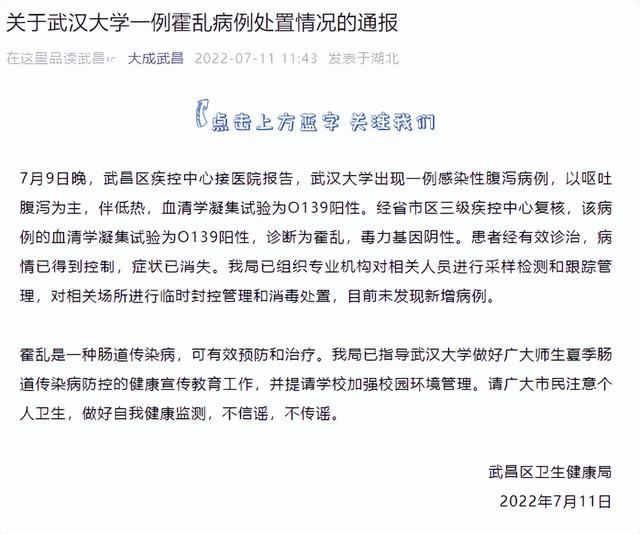据大成武昌微信公众号消息:7月9日晚,武昌区疾控中心接医院报告,武汉大学出现一例感染性腹泻病例,以呕吐腹泻为主,伴低热,血清学凝集试验为O139阳性。经省市区三级疾控中心复核,该病例的血清学凝集试验为O139阳性,诊断为霍乱,毒力基因阴性。患者经有效诊治,病情已得到控制,症状已消失。我局已组织专业机